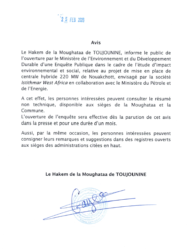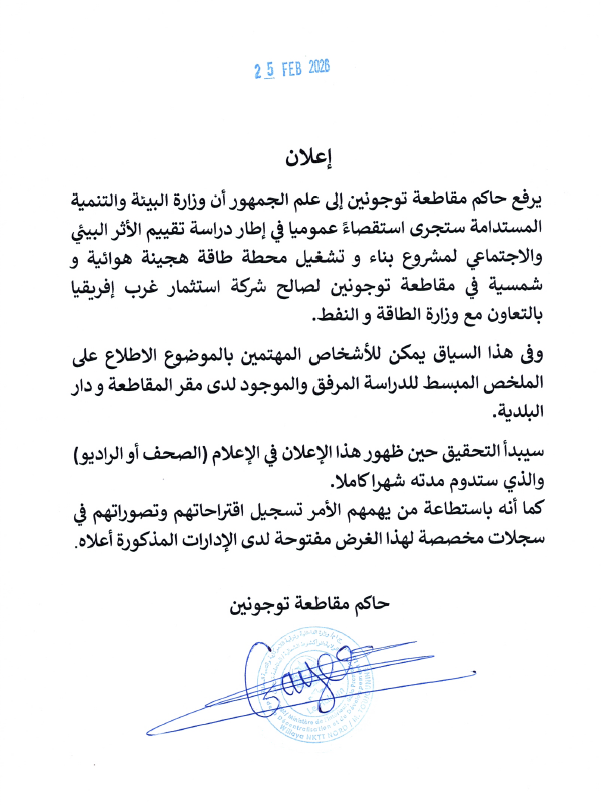 أعلن حاكم مقاطعة توجنين، اليوم الأربعاء 25 فبراير 2026، عن فتح تحقيق عمومي بخصوص مشروع ذي طابع بيئي واجتماعي، يتعلق بدراسة تقييم الأثر البيئي والاجتماعي لمشروع بناء وتشغيل محطة طاقة هجينة (هوائية وشمسية) بمقاطعة توجنين.